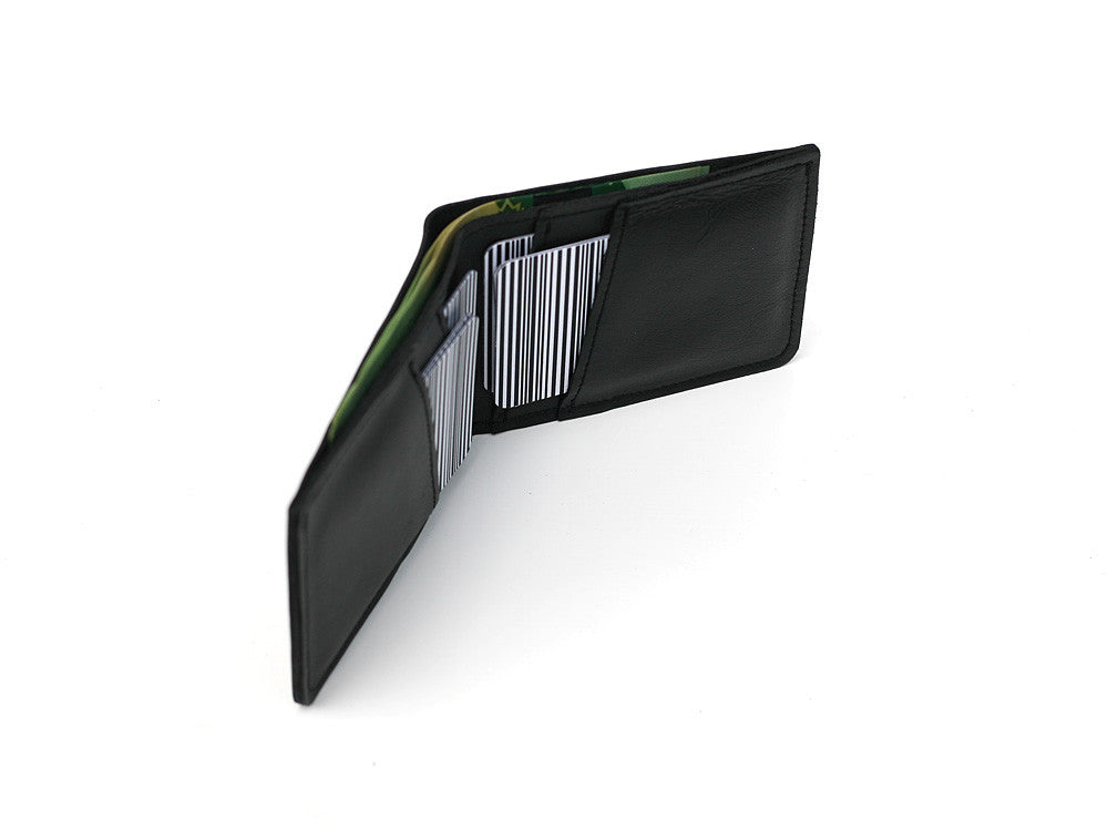 inside a bag, this unisex wallet stands out with high quality leather and stitching.